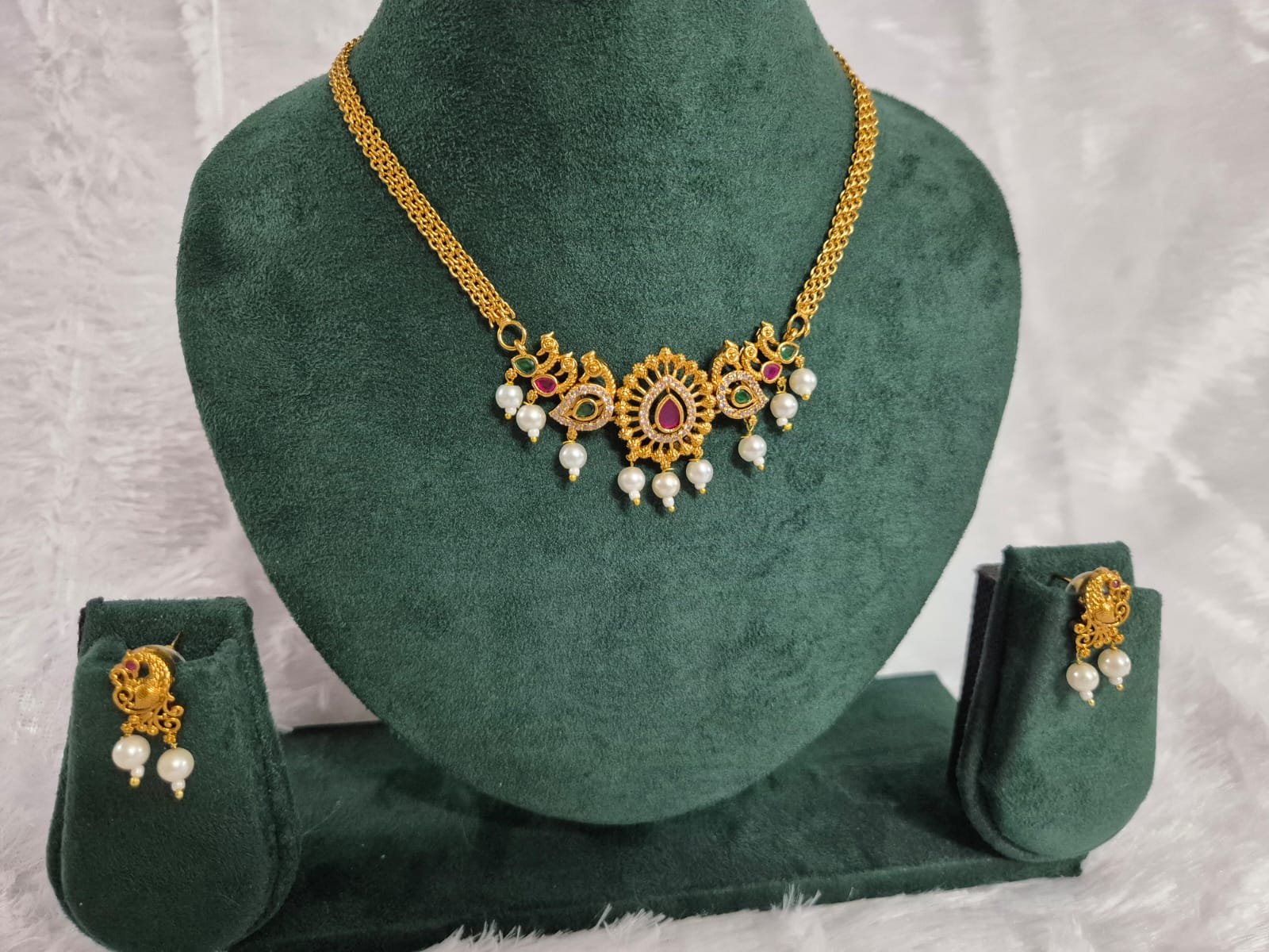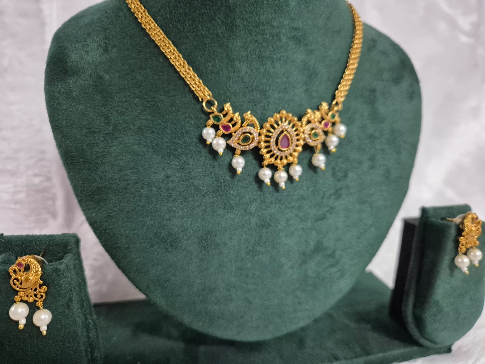 The intricate motifs with ruby–emerald accents and dangling pearls give it a temple jewellery elegance with a timeless charm