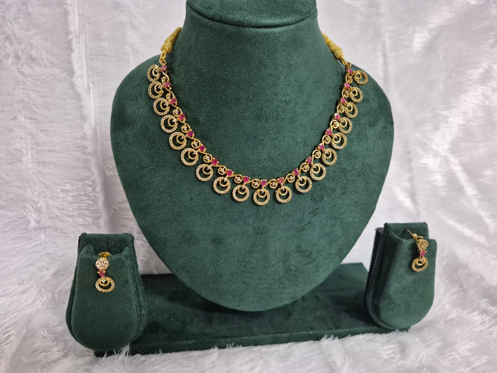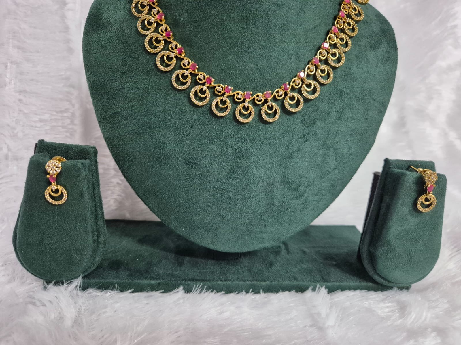 The cascading circular design with pink stone highlights resembles dewdrops kissed with a touch of rose elegance.